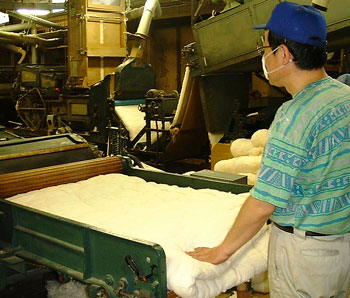 硬くなったわたが機械でほぐされ、ふんわりした状態になります。