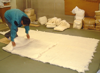 熟練の技術を持つ職人が1枚ずつわたを重ねていきます。