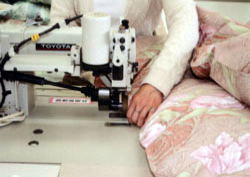 適量の側地に羽毛を吹き込んだ後、縫製します。